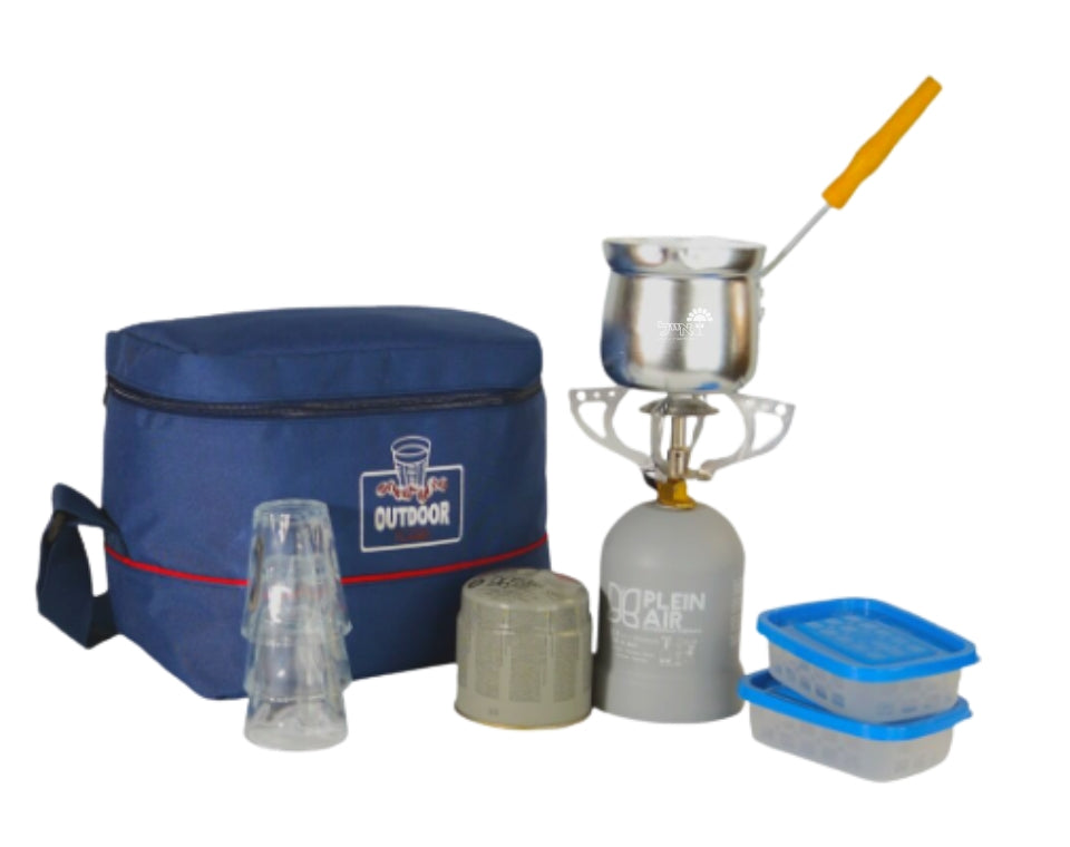 ערכת קפה במארז של חברת OUTDOOR תיק בד עם רצועת נשיאה לכתף הערכה מכילה גזיה פלוטון 3 כוסות זכוכית 2 קופסאות אחסון