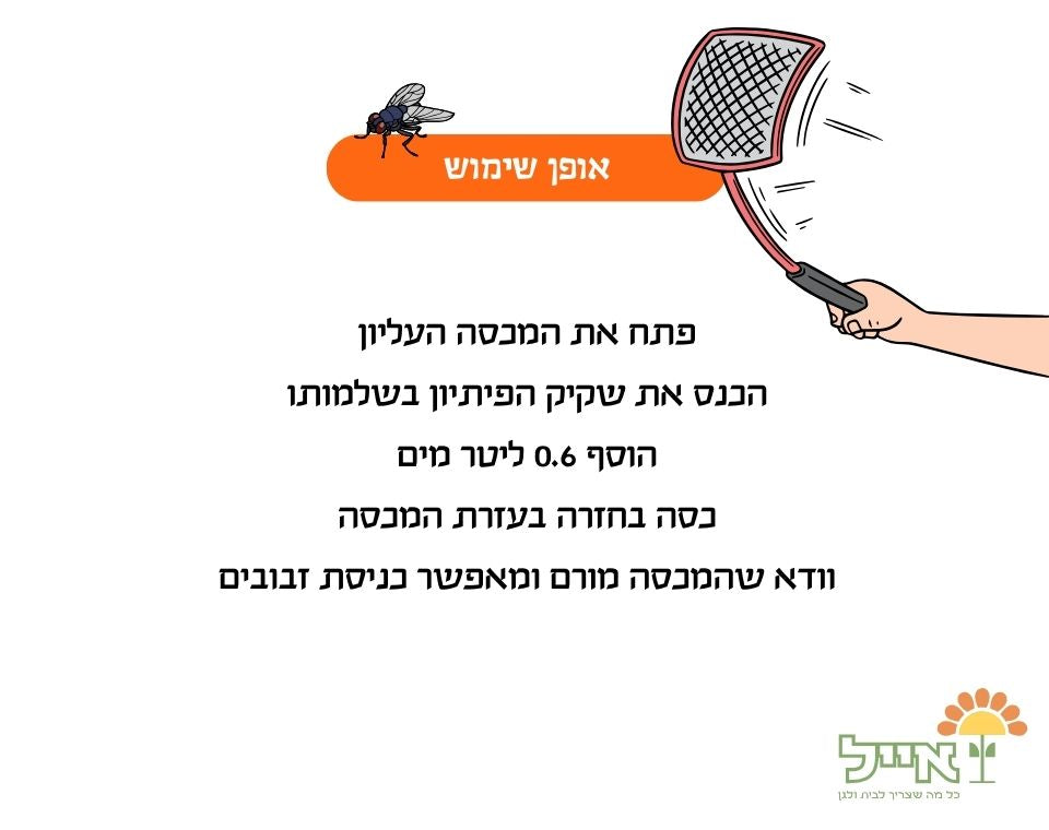 כיצד משתמשים במוצר? מכניסים את שקיק הפתיון בשלמותו, מוסיפים מים עד הסימון (600 סמ״ק), ותולים את המלכודת בשמש; יש להחליף פתיון כל 21 יום או כשהיא מתמלאת.