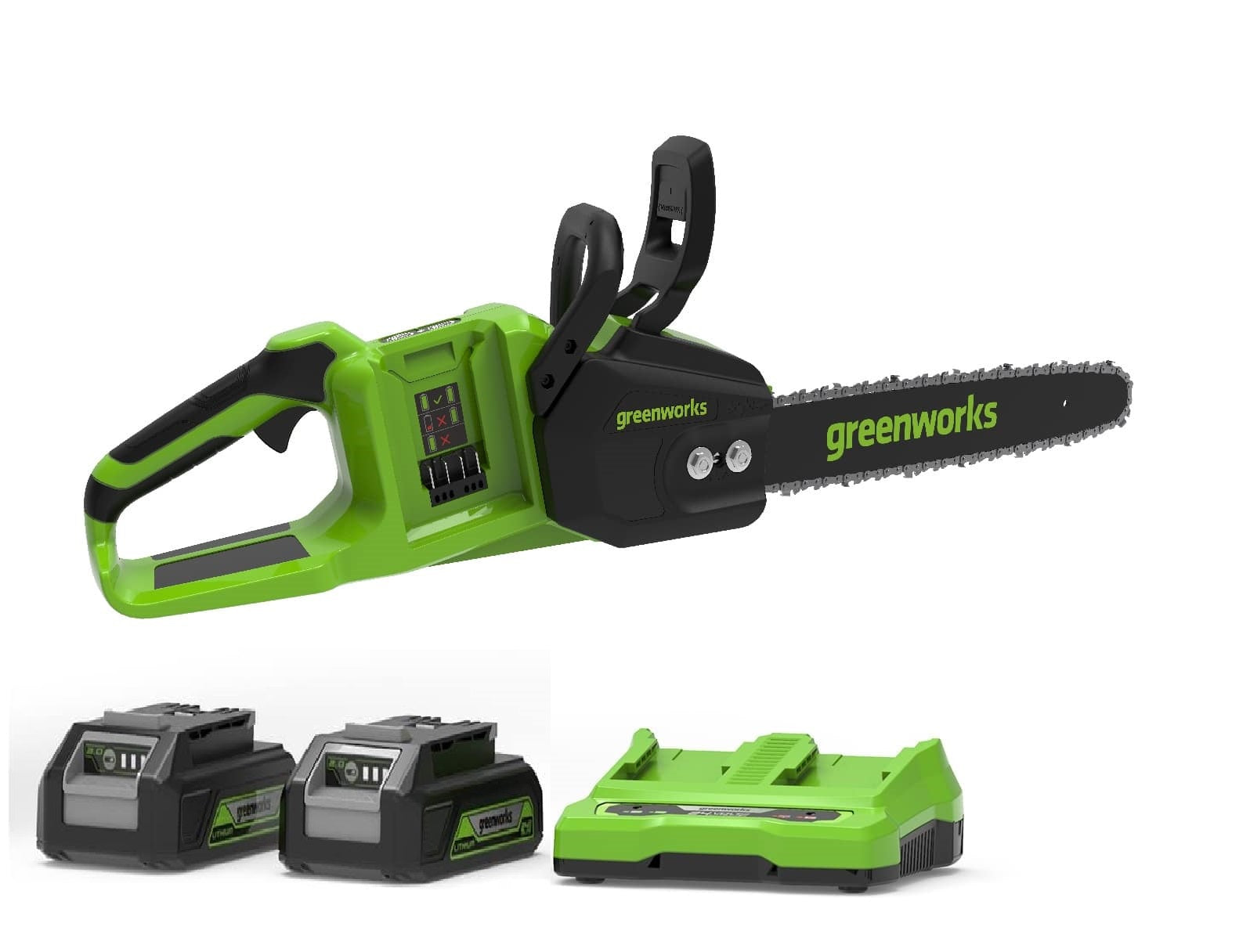 מסור שרשרת 14 אינץ' מבית Greenworks הפועל במתח 48V (שילוב של 2 סוללות 24V), המספק עוצמה גבוהה לצד עבודה אלחוטית נוחה ויעילה.