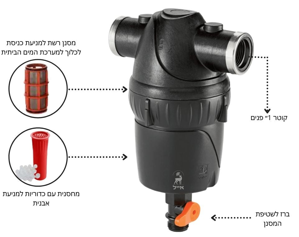 המסנן כולל ברז ניקוז המשמש לשטיפת הלכלוך הגס שנאסף