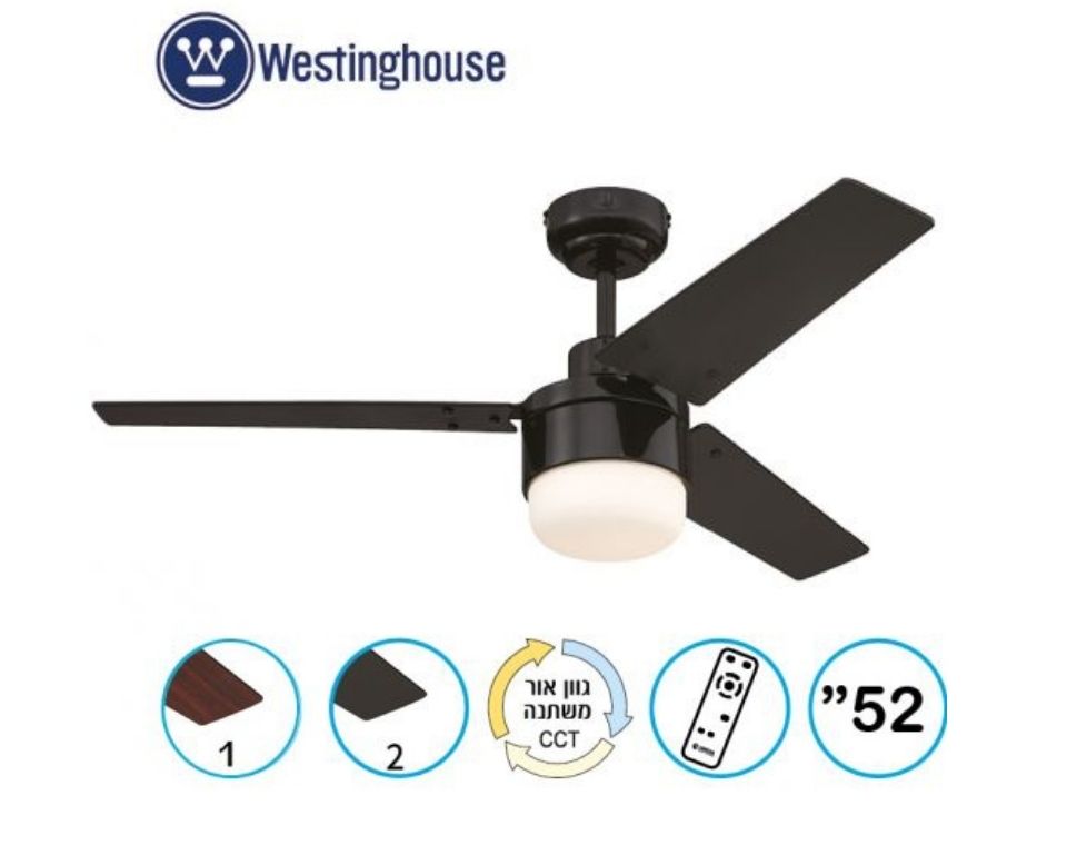 מאוורר תקרה דקורטיבי מבית המותג האמריקאי WESTINGHOUSE בקוטר 52" ,מתאים לחדרים בגודל עד 36 מ”ר מנוע עוצמתי ושקט במיוחד בעל יעילות אנרגטית גבוהה, הפעלה באמצעות שלט גוף תאורה מובנה 20W גוון אור משתנה 3000K ,4000K ,6500K 15 שנות אחריות על המנוע ושנתיים אחריות על החלקים