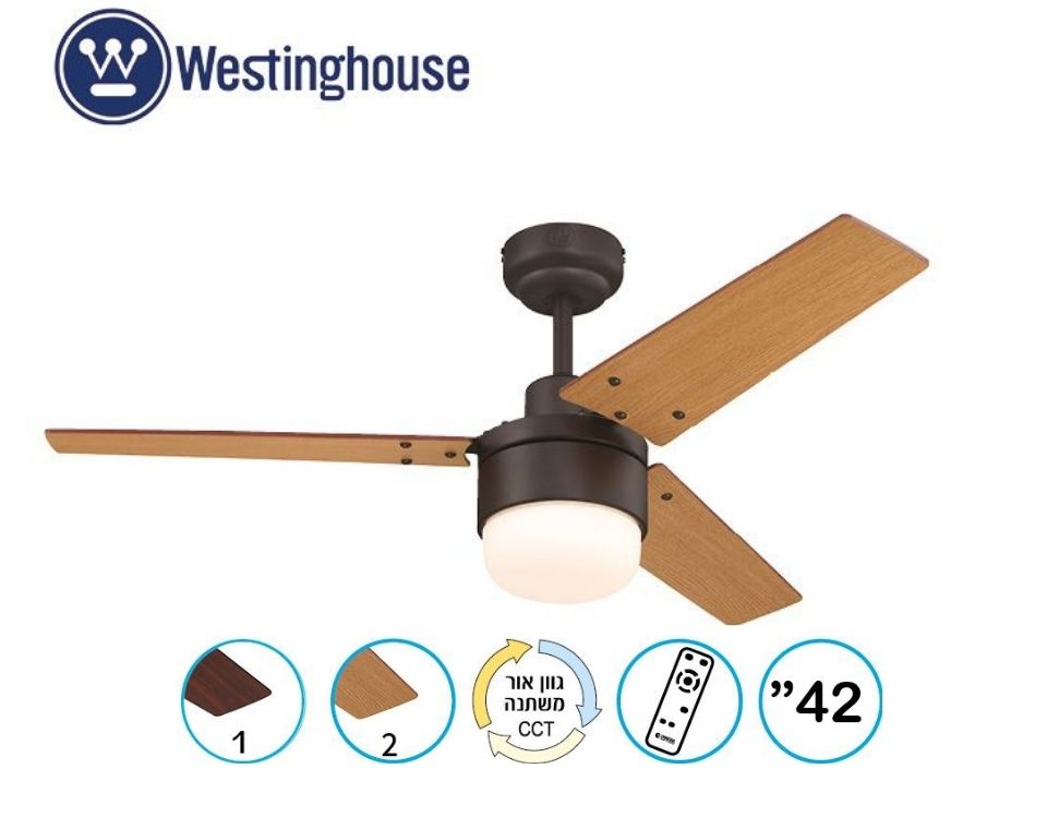 מאוורר תקרה דקורטיבי מבית המותג האמריקאי WESTINGHOUSE בקוטר 42" ,מתאים לחדרים בגודל עד 20 מ”ר מנוע עוצמתי ושקט במיוחד בעל יעילות אנרגטית גבוהה, הפעלה באמצעות שלט גוף תאורה מובנה 20W גוון אור משתנה 3000K ,4000K ,6500K 15 שנות אחריות על המנוע ושנתיים אחריות על החלקים