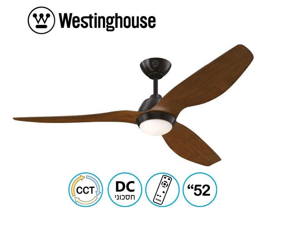 מאוורר תקרה דקורטיבי מבית המותג האמריקאי WESTINGHOUSE בקוטר 52 ,“מתאים לחדרים בגודל עד 36 מ”ר מנוע עוצמתי DC שקט במיוחד בעל יעילות אנרגטית גבוהה, הפעלה באמצעות שלט גוף תאורה מובנה 20W גוון אור משתנה 3000K ,4000K ,6500K 15 שנות אחריות על המנוע ושנתיים אחריות על החלקים