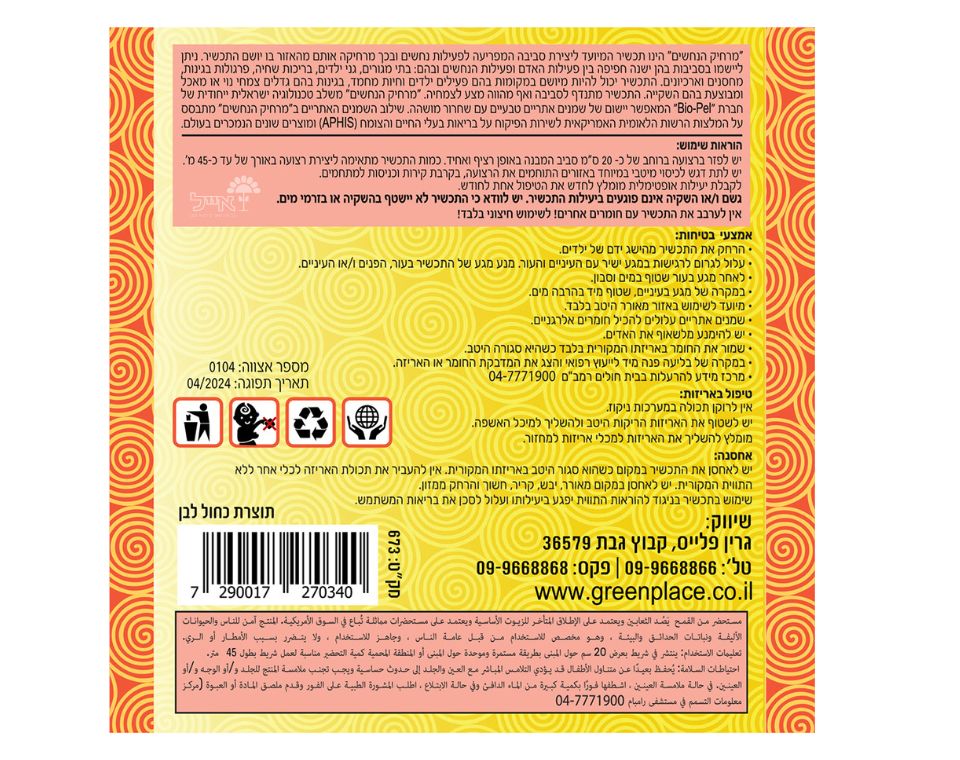 תכשיר גרגרי המרחיק נחשים על בסיס שחרור מושהה של שמנים אתריים התכשיר יוצר סביבה המפריעה לפעילות הנחשים ובכך מרחיקה אותם מהאזור בו יושם התכשיר התכשיר בטוח לאנשים, חיות מחמד, צמחי גינה ולסביבה