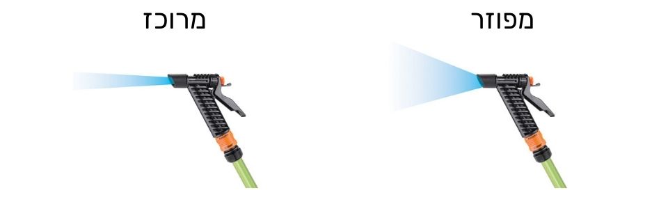 האקדח כולל 2 אפשרויות התזה, שמאפשרות שליטה על אופן זרימת המים בהתאם לצורך – מהשקיה עדינה ועד שטיפה נקודתית.