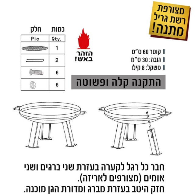 מתאימה לבעירה באמצעות עצים או פחמים וכוללת רשת גריל ורשת מגן לבטיחות מפני גיצים.