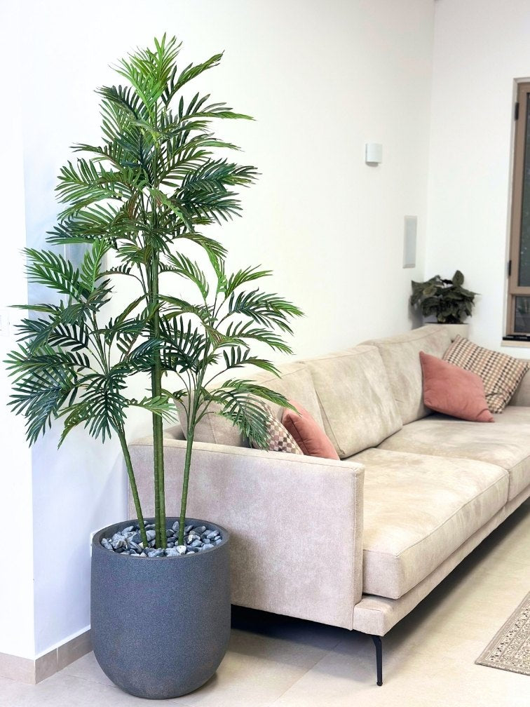 עץ מלאכותי דקל | כד אגס בינוני | גובה 1.90 מטר | אייל לבית ולגן, עלים איכותיים, מגע טבעי, מרשים לאווירת הבית ניתן בכל שלב לשנות את צבע הכד ואת צבע חלוקי הנחל ביצירת קשר עם נציג