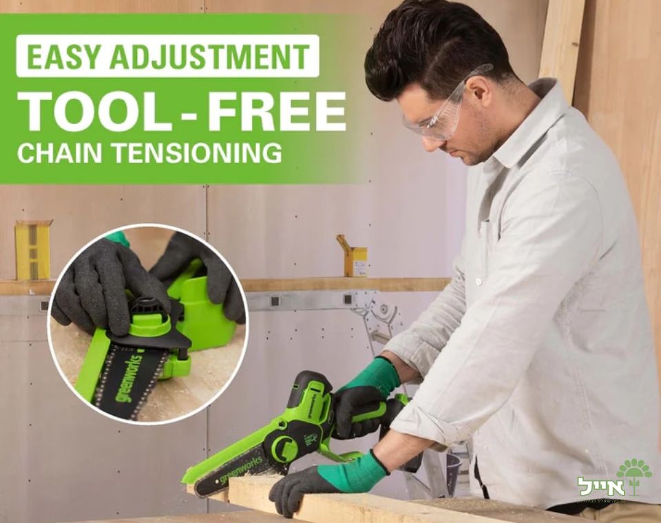 דיל מסור שרשרת נטען 24V מבית Greenworks הכולל סוללה 2Ah ומטען מיקרו – פתרון קומפקטי, יעיל ונוח לגיזום ענפים ותחזוקת עצים ושיחים. מדובר במסור מיני נטען המשלב מנוע Brushless חזק וחסכוני במיוחד, המספק ביצועים מרשימים לצד עמידות גבוהה לאורך זמן.