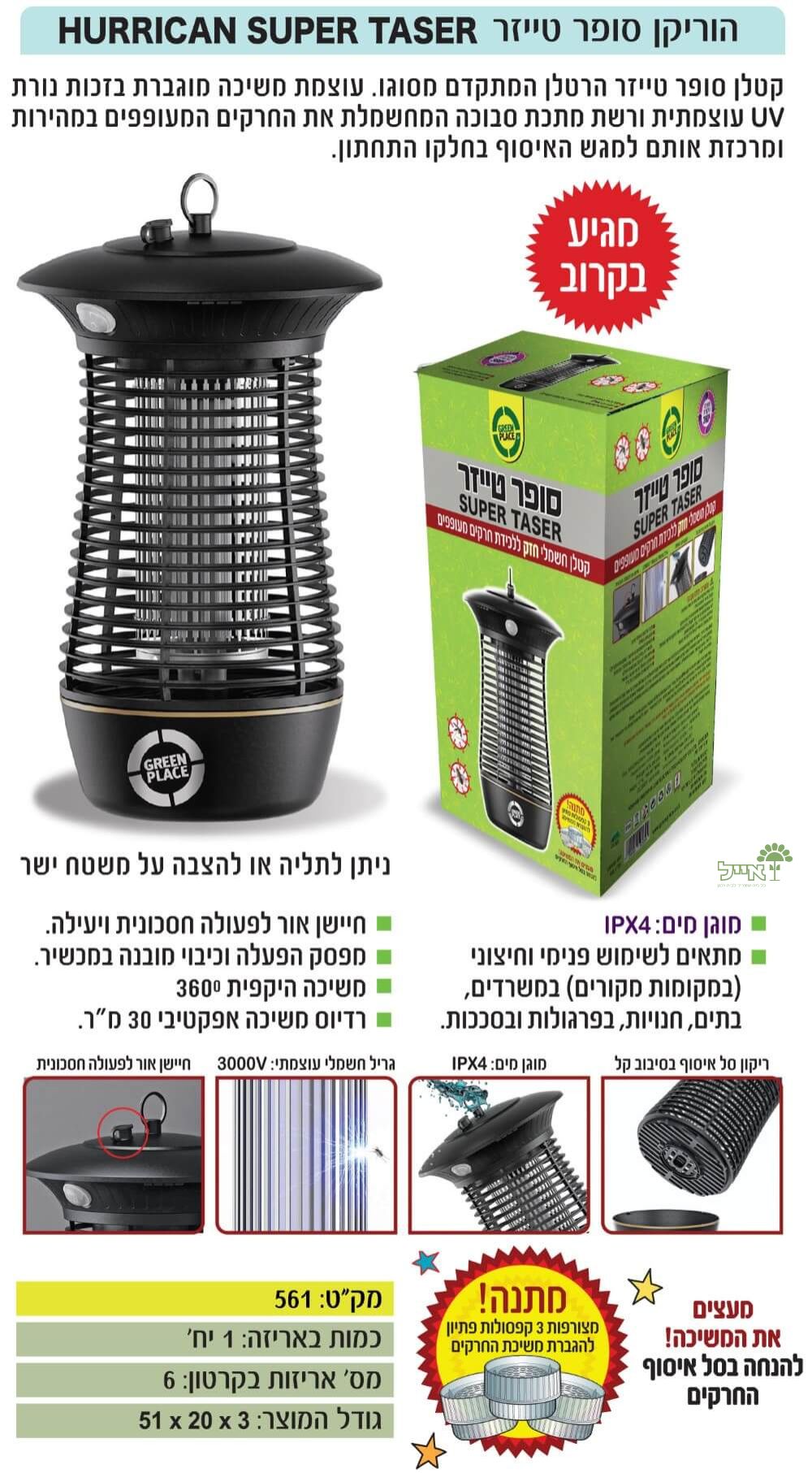 הסופר טייזר 360 מיועד ללכידת יתושים, זבובים, עש ושאר חרקים מעופפים בבית, בגינה או במרפסת, בצורה בטוחה וללא שימוש בחומרי הדברה.