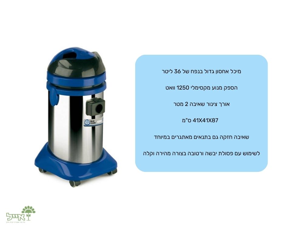 שואב אבק חשמלי מקצועי רטוב יבש 1250 וואט 36 ליטר BLUE CLEAN פתרון המושלם לניקיון מקצועי ויעיל במגוון רחב של סביבות מתאים לשימוש בבית, במשרד, במוסך, או באתרי עבודה מעולה לשימוש עם פסולת יבשה ורטובה בצורה מהירה וקלה. המוצר שוקל 12.6 ק"ג מידות 41X41X87 ס"מ