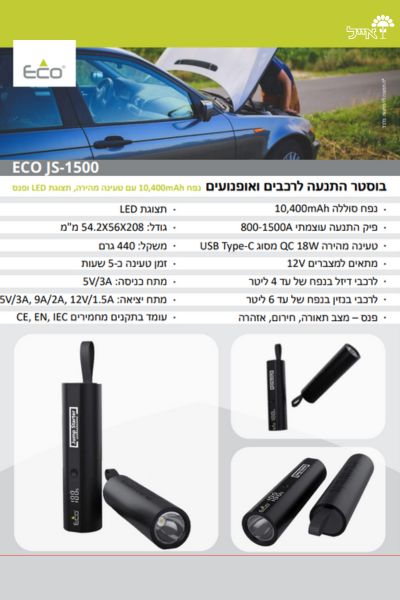 בוסטר התנעה ECO JS 1500 מעולה עבור רכבי בנזין עד 6 ליטר ורכבי דיזל עד 4 ליטר פתרון מהיר ויעיל להנעה בכל תנאי בעל נפח סוללה של 10,400mAh ופיק התנעה עוצמתי של 800-1500A הבוסטר מתמודד גם עם התנעות קשות בתנאים מאתגרים עם פונקציית “התנעה כפויה”- במקרים חריגים, כשהמצבר חלש ולא ניתן להתניע, ישנה פונקצייה של "התנעה כפויה" הערכה כוללת טעינה מהירה QC 18W דרך חיבור USB Type-C טעינה מהירה של הבוסטר עצמו תוך כ-5 שעות בלבד תצוגת LED אינטואיטיבית מציגה את מצב הסוללה והפונקציות השונות בזמן אמת