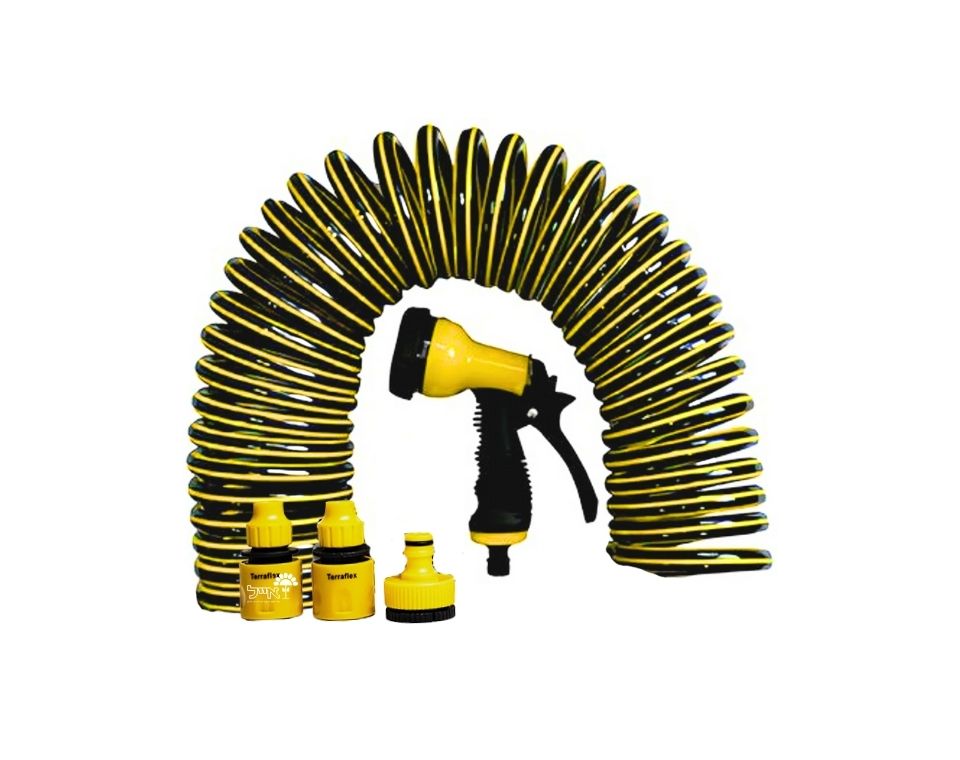 הסט כולל צינור ספירלי באורך 15 מטר, אקדח התזה ומחברים מהירים לחיבור נוח ופשוט.