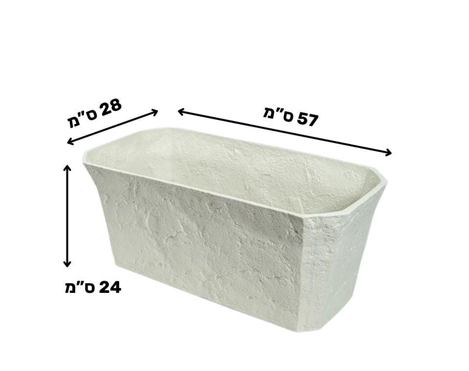 אדנית בעיצוב דמוי אבן טבעית עם מרקם מחוספס ועדין המעניק לה מראה אותנטי ויוקרתי. הצבע השמנת הטבעי משתלב בצורה מושלמת עם צמחייה ירוקה ועם מגוון רחב של סגנונות עיצוב – מודרני, כפרי וקלאסי. הצורה המלבנית מאפשרת שתילה מסודרת ונוחה של מספר צמחים יחד ליצירת קומפוזיציה עשירה ומרשימה.