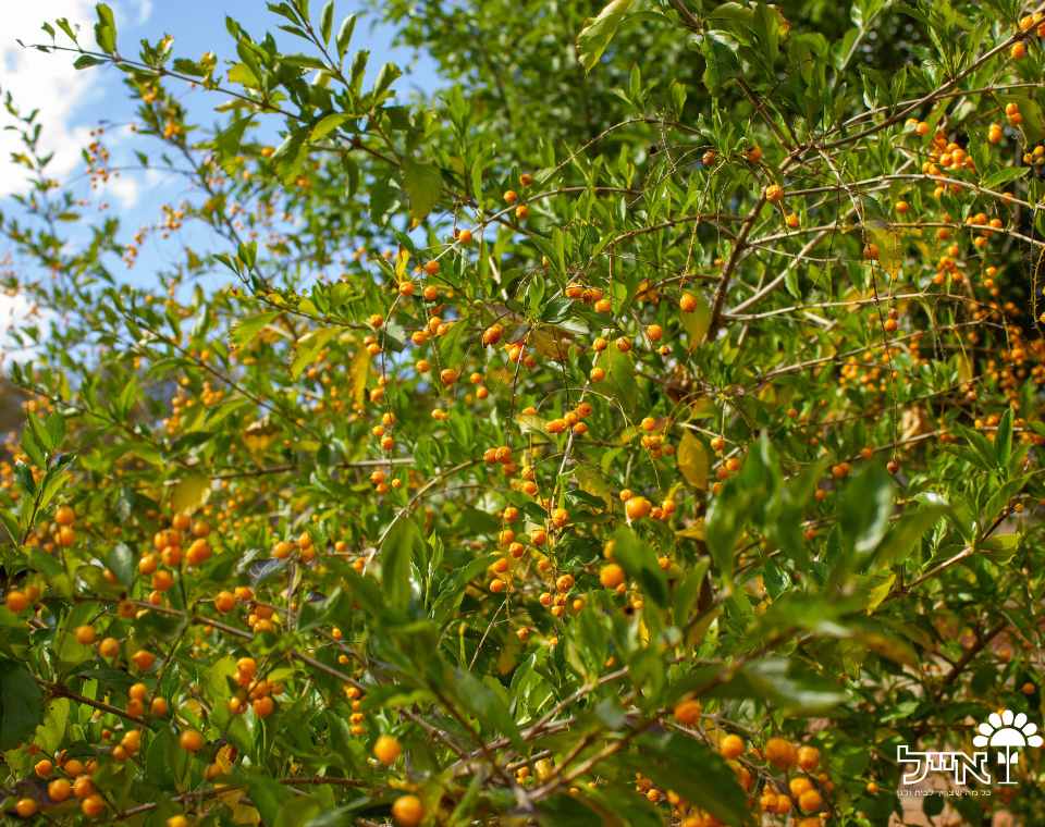 פריחה: פריחה אביבית־קיצית קטנה וסגולה, ולאחריה הופעת פירות כתומים־צהובים דקורטיביים