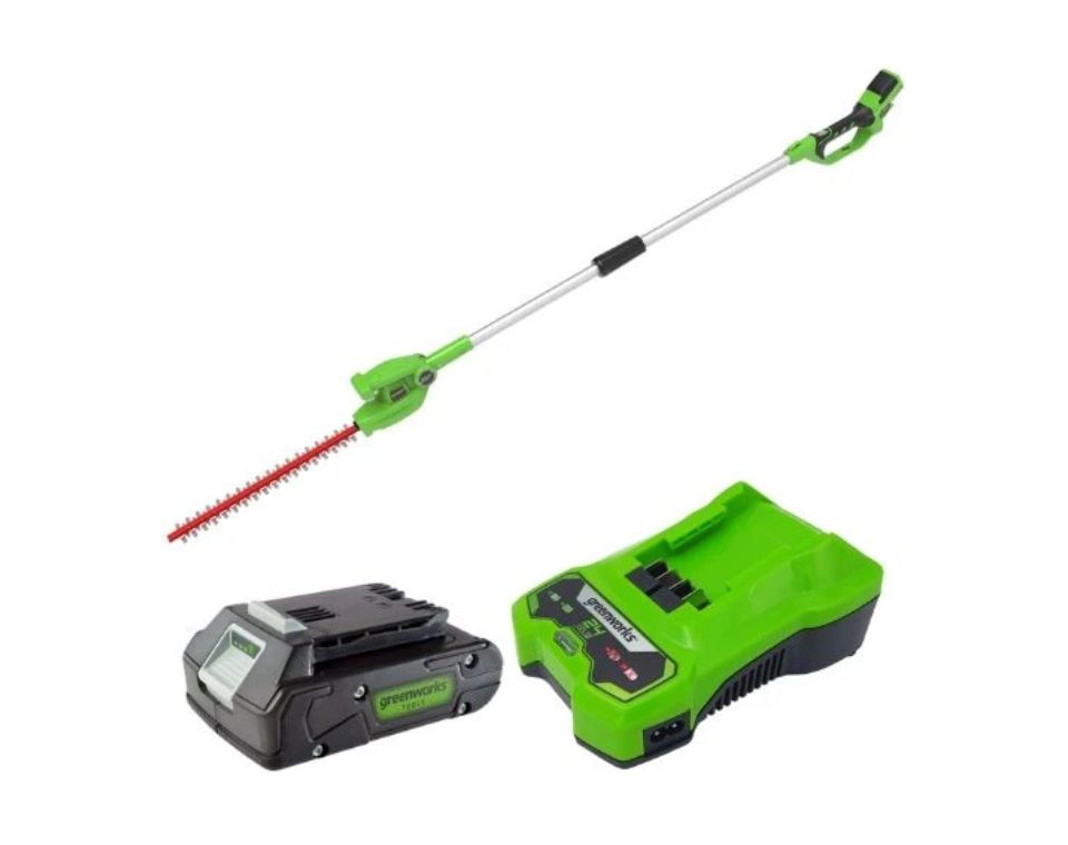 מגזמת גובה 24V דגם משופר מבית Greenworks מיועדת לגיזום גדרות חיות ושיחים גבוהים בצורה נוחה ובטוחה, ישירות מהקרקע וללא צורך בסולם.