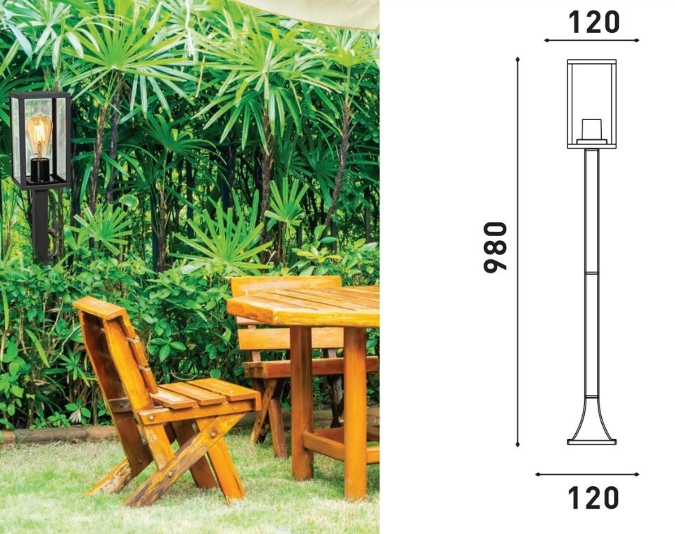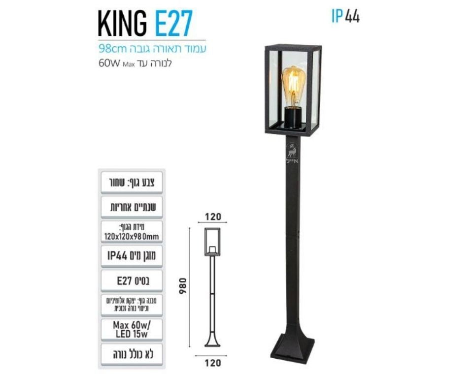 עמוד תאורה מוגן מים בעיצוב אלגנטי, דגם KING בסיס נורה E27 , הספק מקסימלי לנורה 60W, הנורה לא כלולה שנתיים אחריות, רמת אטימות IP44 אידיאלי לשימוש הארת שבילים, פארקים, מדשאות, גנים ועוד ובנוי מגוף יציקת אלומיניום, וזכוכית