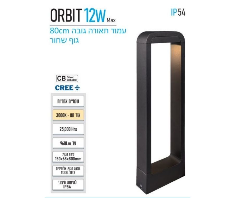 עמודון תאורה BOLLARD דקורטיבי בעיצוב מודרני ואלגנטי בהספק 12W, גוון אור חם הרכבה ותחזוקה קלה אמת יעילות אורית W/80Lu, דרייבר KEGU CB , ולדים של חברת CREE גובה עמוד 80 ס''מ אורך חיים 25,000 ש”ע, רמת אטימות IP65