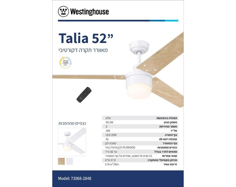 מאוורר תקרה דקורטיבי 52" | דגם Talia | לבן | כולל גוף תאורה מובנה