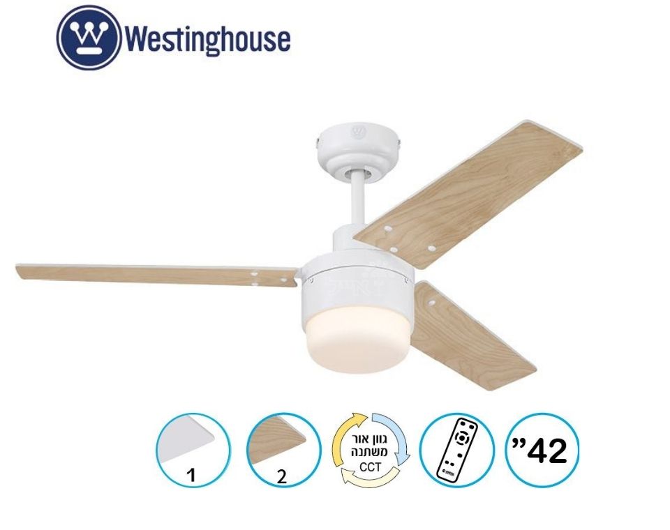 מאוורר תקרה דקורטיבי מבית המותג האמריקאי WESTINGHOUSE בקוטר 42" ,מתאים לחדרים בגודל עד 20 מ”ר מנוע עוצמתי ושקט במיוחד בעל יעילות אנרגטית גבוהה, הפעלה באמצעות שלט גוף תאורה מובנה 20W גוון אור משתנה 3000K ,4000K ,6500K 15 שנות אחריות על המנוע ושנתיים אחריות על החלקים