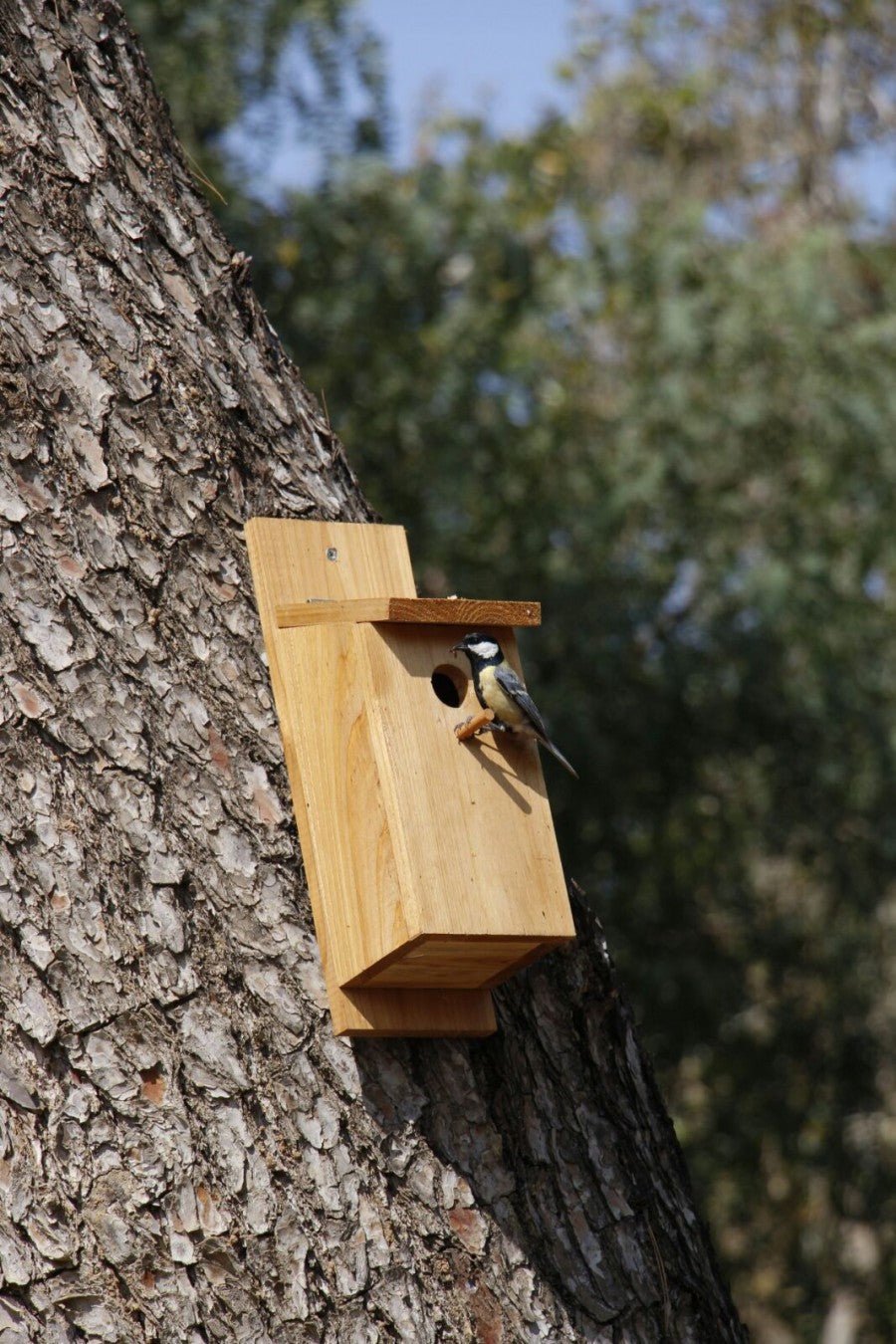 תיבת קינון בצבע עץ טבעי, בעלת גג נפתח.