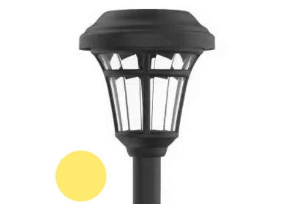 עמוד תאורה סולארי גוון אור צהוב חם עמוד תאורה סולארי בעל נורות לד עוצמתית ואיכותית עשוי פלסטיק התקנה עם דוקרן לאדמה או לאדנית פאנל סולארי בראש המנורה מתג הפעלה ON/OFF ובחירת גוון האור
