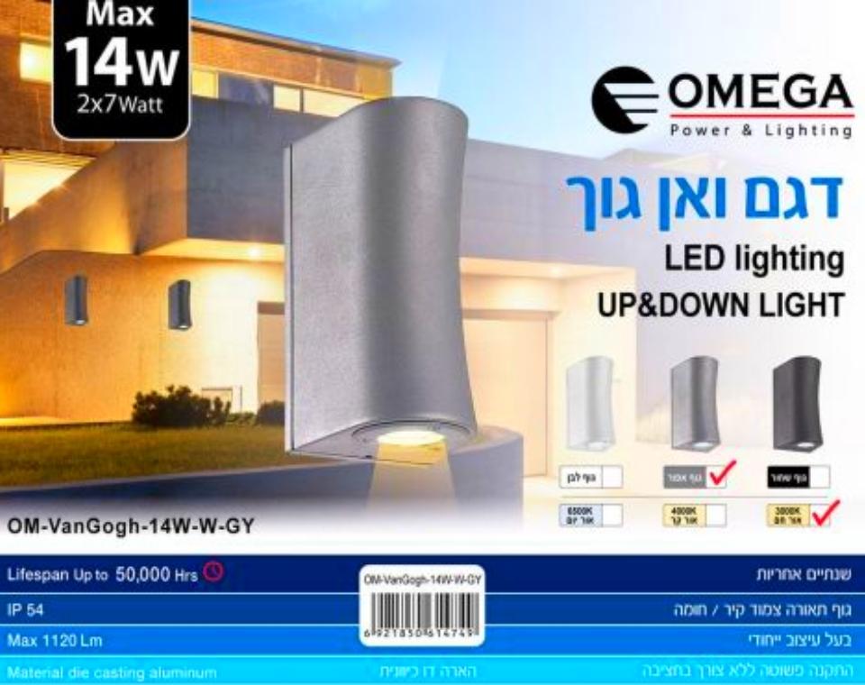 סדרת צמודי קיר VAN GOGH אפ & דאון, מוגני מים בעיצוב מודרני מק"ט : OM-VanGogh-14W-GY גוון אור : אור חם מבנה גוף : בסיס יציקת אלומיניום כיסוי PC צבע הגוף : אפור הספק : 14W מידות הגוף : 80x162x84mm דרגת אטימות : IP54 מתח כניסה :AC220 240V
