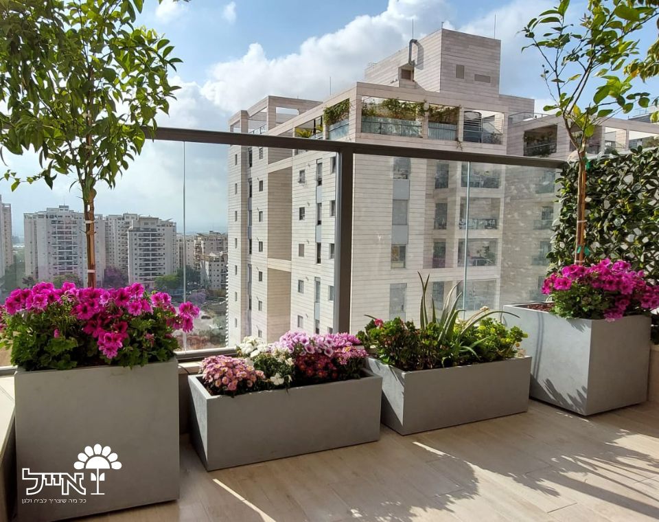 שילוב של מספר אדניות מאותו הדגם בגדלים שונים יוצר קו עיצוב אחיד, מודרני ומרשים – אידיאלי למרפסות גדולות, לובאים וכניסות לבתים.