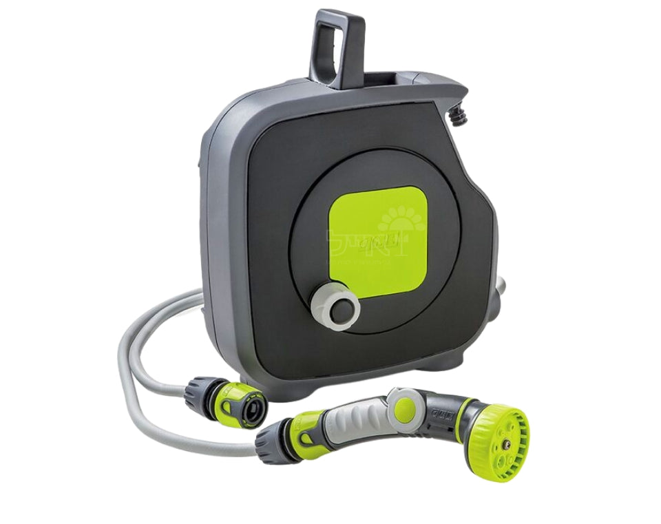 הערכה כוללת גלגלת ירוקה עם צינור 11.5 מטר, אקדח השקיה מתכוונן בעל 8 מצבים וכל החיבורים הנלווים לחיבור מהיר ונוח.