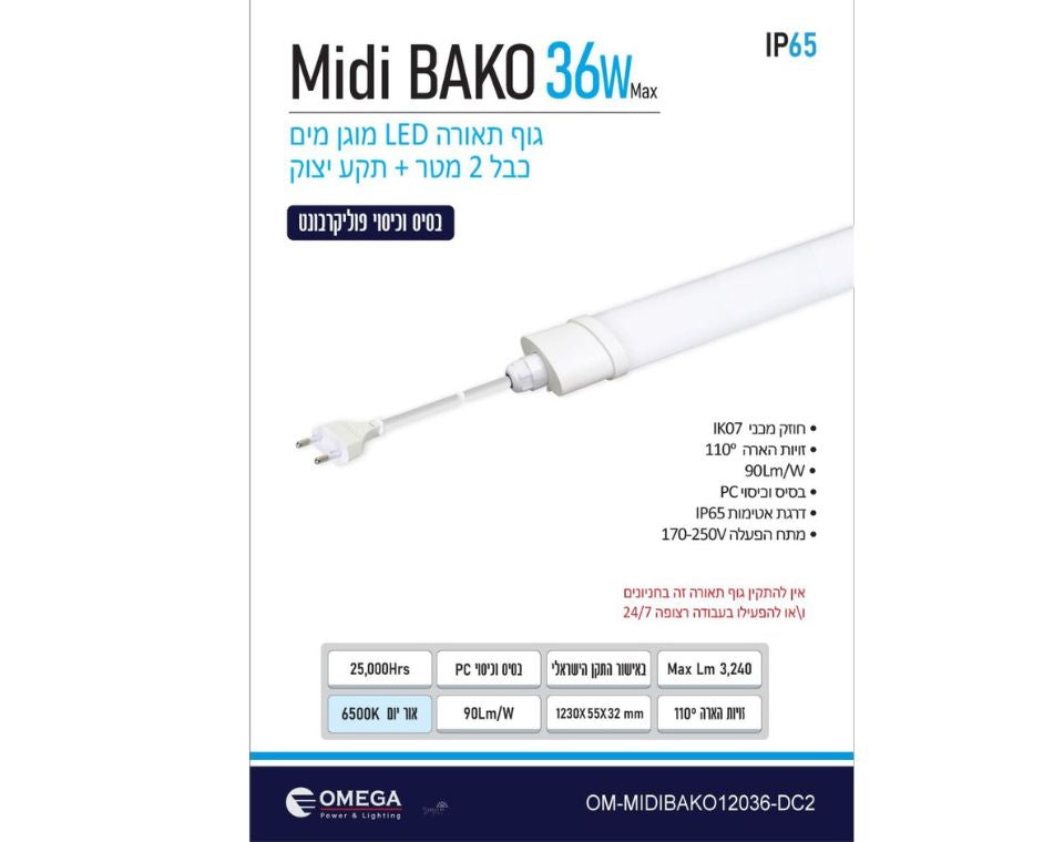 גוף תאורה מוגן מים של חברת OMEGA אידיאלי להתקנה חיצונית , פרגולות, תאורה היקפית לבית ,מתאים לתליה בסוכה, התקנה פשוטה וקלה דגם : OM-MIDIBAKO12036-DC2 הספק : 36W גוון אור : אור יום לומן : 3240 מבנה גוף : בסיס וכיסוי PC צבע גוף : לבן