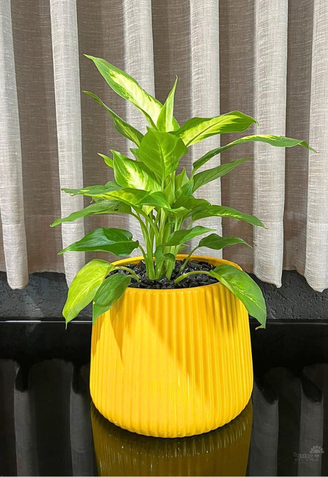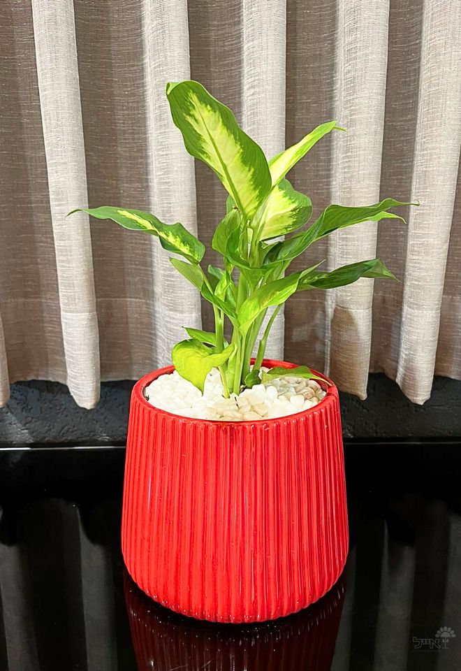 כד דקורטיבי בעיצוב פסים נקי ומודרני, אידיאלי לשימוש בבית ומעולה כמתנה. הכד מגיע שתול בצמח דיפנבכיה, בשילוב אבנים דקורטיביות לבנות/שחורות וחלקות המעניקות מראה אלגנטי ומשדרגות כל חלל בבית ובמשרד.