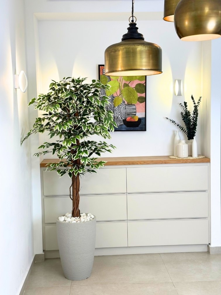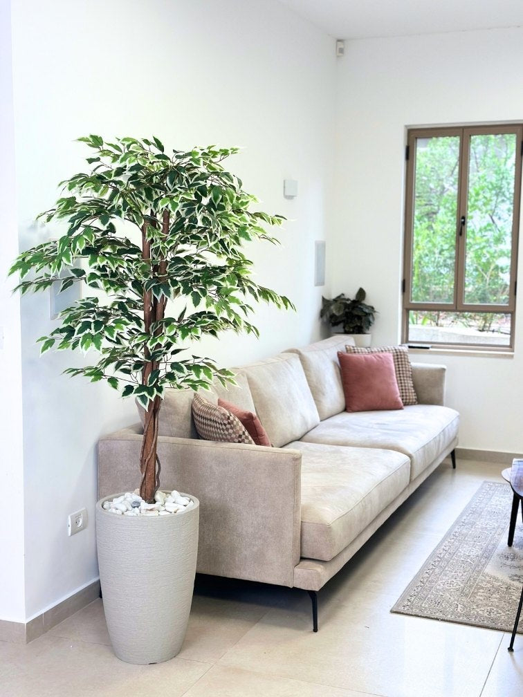 עץ מלאכותי פיקוס בנימינה | כד פמילי בינוני | גובה 1.85 מטר | אייל לבית ולגן, עלים איכותיים, מגע טבעי, מרשים לאווירת הבית ניתן בכל שלב לשנות את צבע הכד ואת צבע חלוקי הנחל ביצירת קשר עם נציג