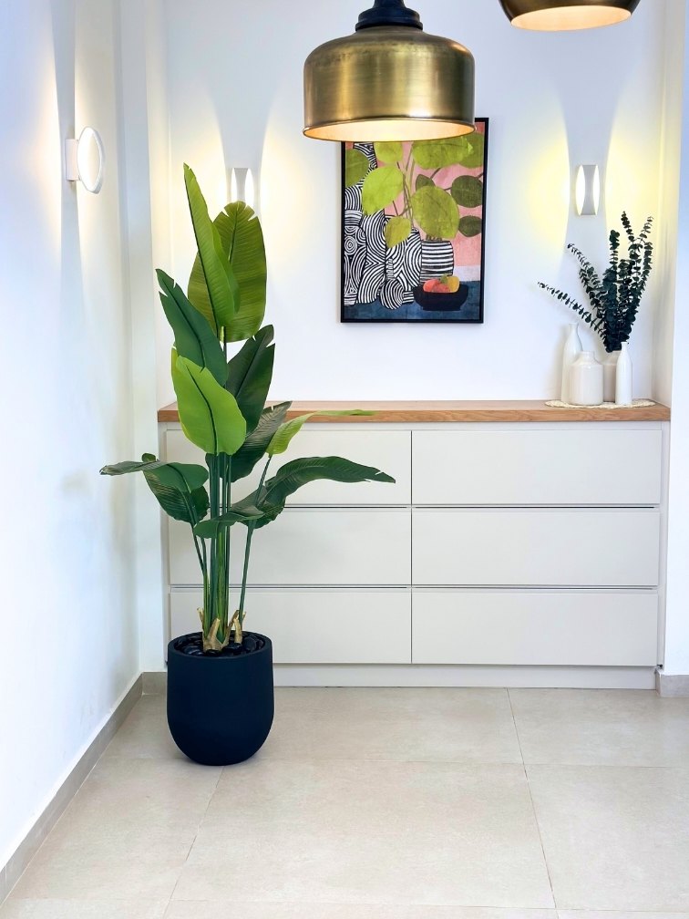 ציפור גן עדן | כד אגס קטן | גובה 1.80 מטר | אייל לבית ולגן, עלים איכותיים, מגע טבעי, מרשים לאווירת הבית ניתן בכל שלב לשנות את צבע הכד ואת צבע חלוקי הנחל ביצירת קשר עם נציג