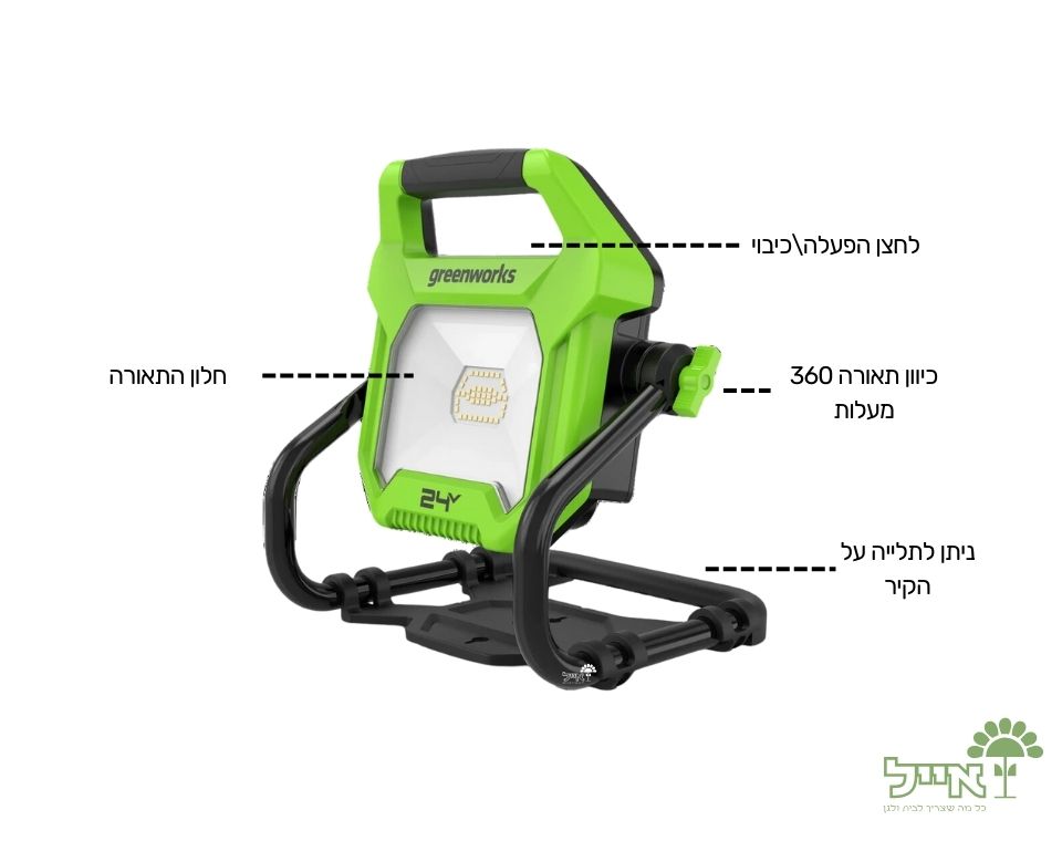 פנס מתכוונן נטען מחברת greenworks, מאוד מוכרת ואמינה בתחום הגינון וטיפוח הבית מעולה לעבודה בשטח או קמפינג ידית נשיאה לנוחות מירבית, וניתן לתלייה שוקל 1.64 ק''ג מסתובב 360 מעלות בעל 2 עוצמות אור שנתיים אחריות יבואן רשמי