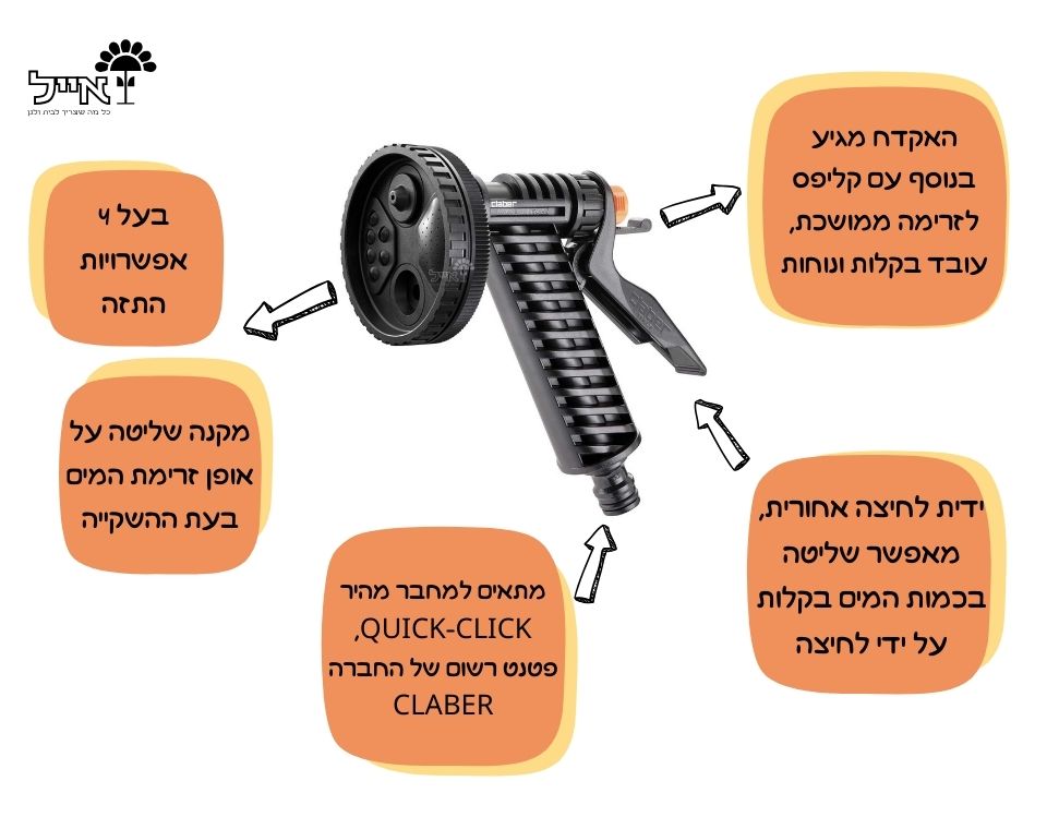 האקדח מתאים למחבר מהיר QUICK-CLICK של CLABER, ומתחבר לצינור גינה דרך מחבר מהיר 1/2’’ או 3/4’’.