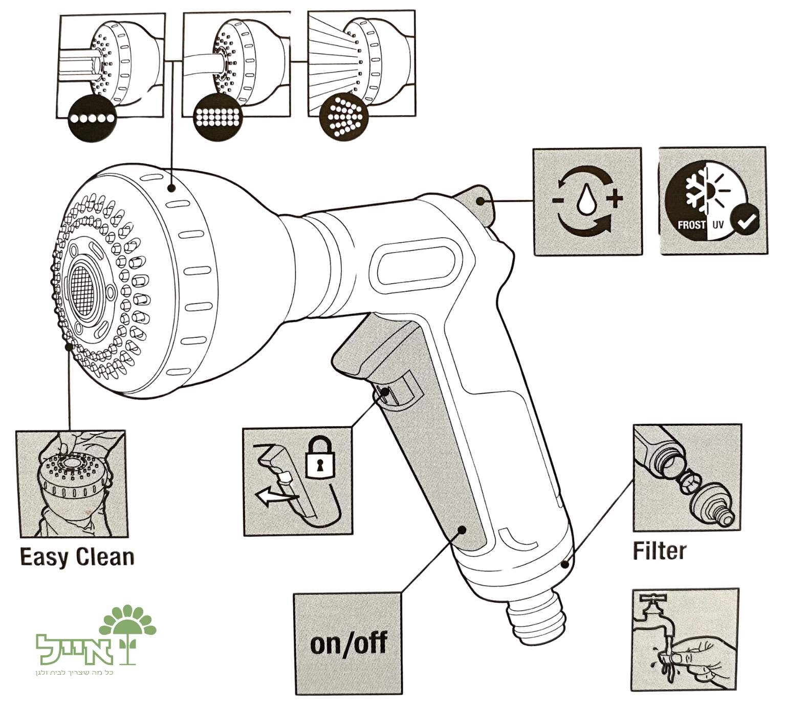 מכשיר מקצועי, 3 ב1 בעל שלושת מצבים המאפשר למשתמש לבחור בין שלושה סוגי זרמים שונים לפי הצורך אקדח המים עשוי מחומרים עמידים מפני קרינת UV ובכל מזג אוויר