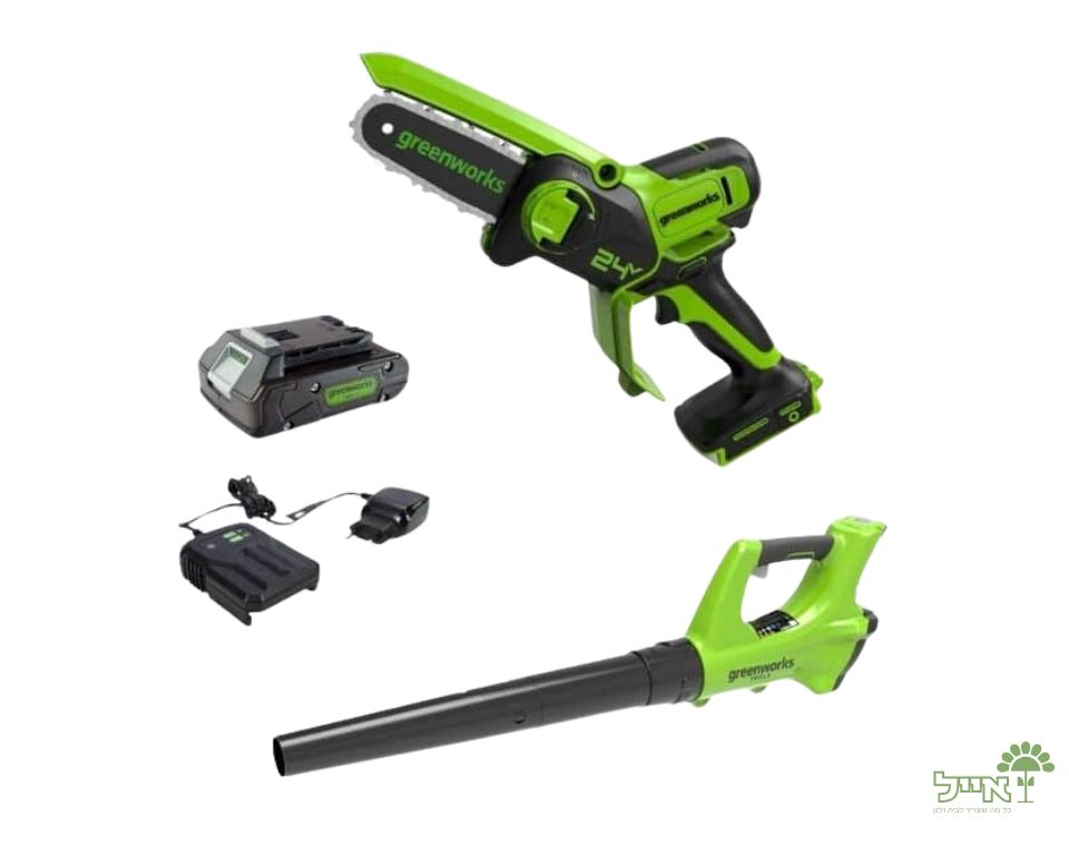 דיל משולב וחכם לגינה הכולל מסור שרשרת נטען 24V, סוללה 2Ah, מטען מיקרו ומפוח עלים 24V מתנה – פתרון מושלם לגיזום מהיר במיוחד ולניקיון יסודי של שבילים, רחבות וגינות פרטיות.