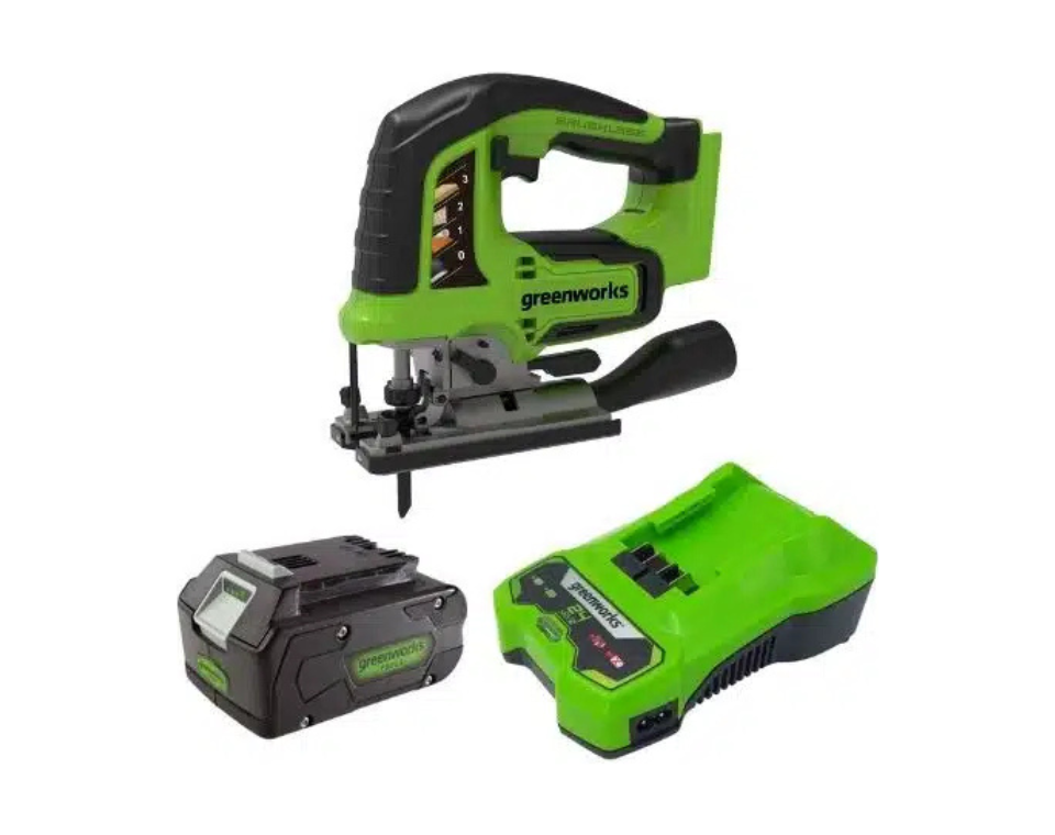 דיוק ועוצמה גבוהה למשימות חיתוך מורכבות המסור פועל על סוללות 24V של Greenworks, ניידות מלאה ונוחות בעבודה ללא חשמל, כולל גוף + סוללה 4.0Ah ומטען מהיר מנוע ללא פחמים מהירות 0-3000 פל"ד עד 100 מ"מ בעץ עד 8 מ"מ במתכת