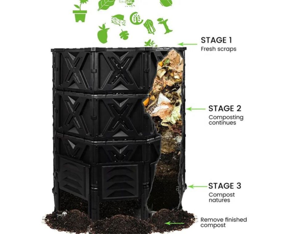 הקומפוסטר הגדול נועד להפוך פסולת אורגנית מהמטבח ומהגינה – כמו ירקות, פירות, קפה, שקיות תה, דשא ירוק וגללי חיות צמחוניות – לדשן טבעי ואיכותי. הוא מתאים במיוחד למשפחות או גינות גדולות בזכות הקיבולת המרשימה שלו.