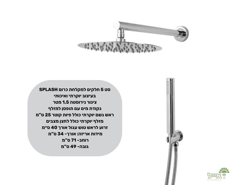 סט המקלחת 5 חלקים SPLASH בגימור כרום יוקרתי פתרון שלם ומרשים לשדרוג חדר הרחצה תוך הקפדה על איכות גבוהה, עמידות ופונקציונליות מתקדמת הסט כולל ראש גשם יוקרתי בקוטר 25 ס"מ עם פיות סיליקון לניקוי קל, מזלף ידני יוקרתי עם לחצן מצבים להתאמה אישית של זרימת המים, זרוע עגולה לראש טוש באורך 40 ס"מ, נקודת מים עם תופסן למזלף, וצינור נירוסטה גמיש באורך 1.5 מטר, המאפשר תנועה חופשית ונוחהה