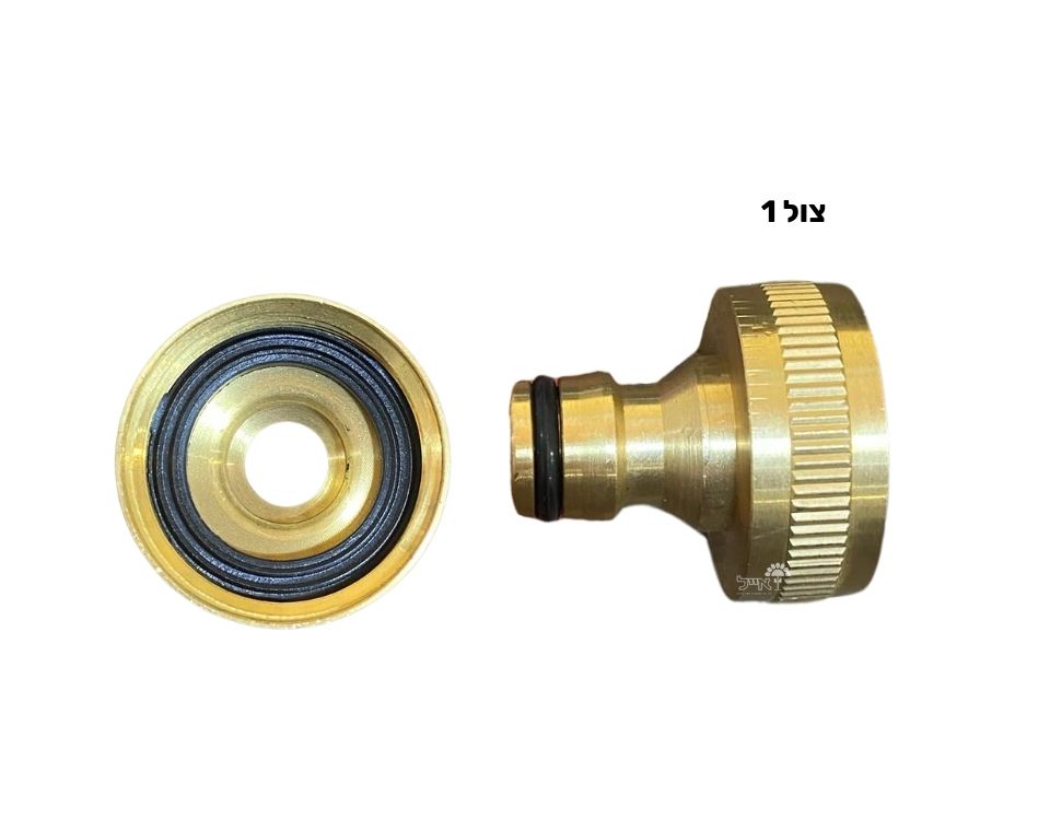 מחבר מהיר עשוי פליז מלא, מיועד להברגה על ברז גינה (1 אינץ') ולחיבור מהיר של קונקטור לצינור השקיה.