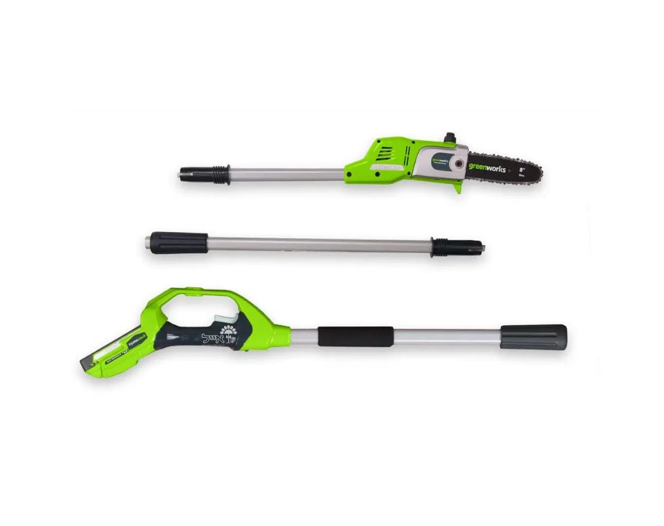 דיל קומבי משתלם של חברת GREENWORKS מוצרים איכותיים ויעילים ביותר שיתאימו לכם למגוון עבודות, מגזמת גובה 24V, מסור גבהים 24V , סוללה 2 אמפר + מטען מיקרו
