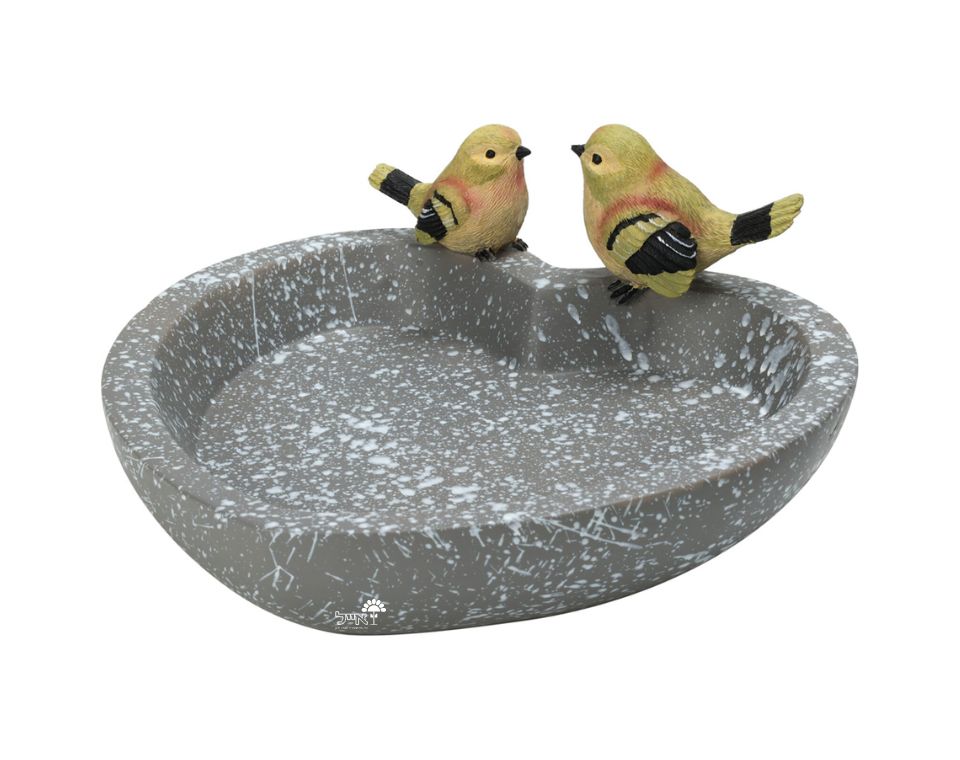 מתקן האכלה מעוצב בצורת לב עם זוג ציפורים צבעוניות, עשוי פולימר POLYSTONE עמיד, בגוון אפור-לבן.