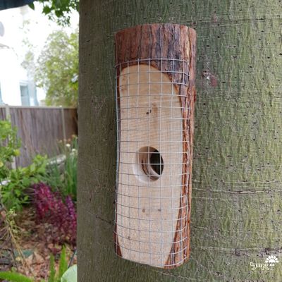 עשוי מענף עץ עבה בגימור טבעי הכולל תא ייעודי למילוי מזון לציפורים